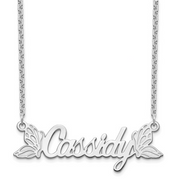 Our NEW exclusive Butterfly Custom Name Necklace is a limited-time Luna Custom Jewelry item. Spread your wings and fly with this sterling silver necklace. With a wing span this butterfly nameplate displays your choice of ten letters in our Aktuelle laser font. This high polished necklace comes with a lobster secured rolo chain.